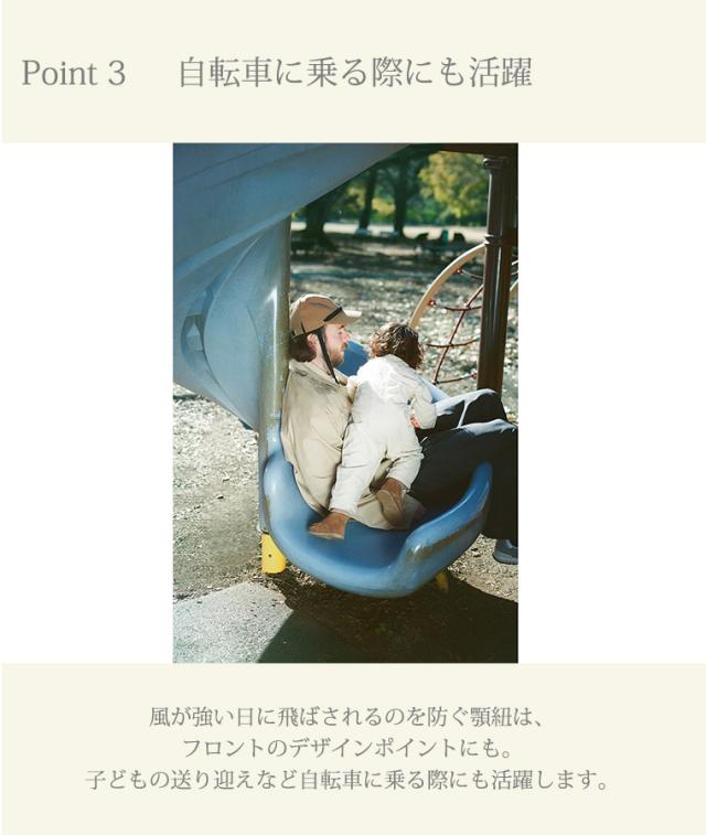 フロントのデザインポイントの顎紐はファッション性だけでなく、風が強い日に飛ばされるのを防いだり、子どもの送り迎えなど自転車に乗る際にも活躍します。アジャスターにはMATOの刻印入り。