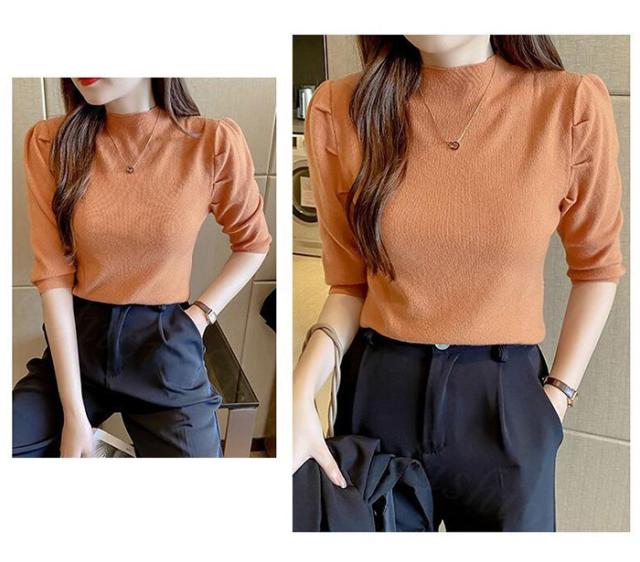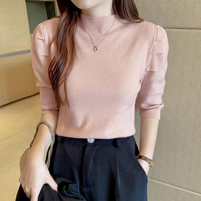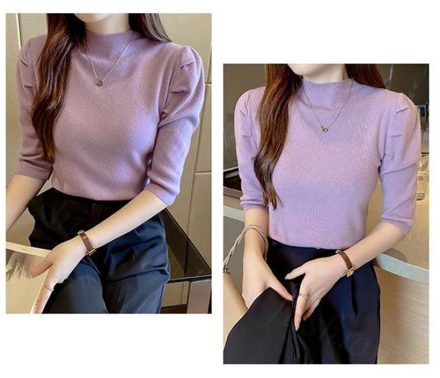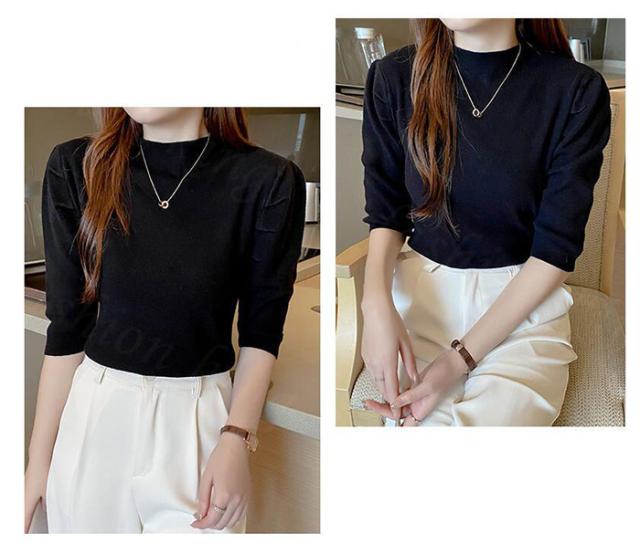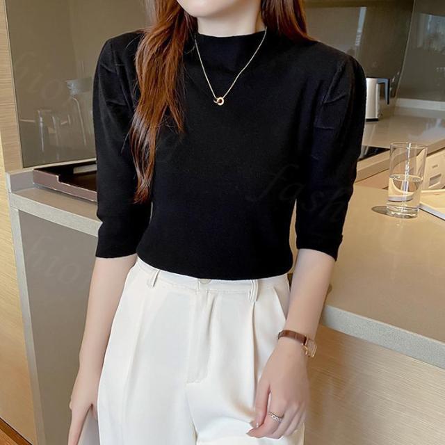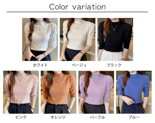 サマーニット パワショル ニット トップス レディース リブニット 半袖 五分袖 タートルネック ハイネック パフスリーブ 無地 オフィスカジュアル 上品 きれいめ 二の腕 カバー 首元 隠し uv 紫外線対策 春夏 秋冬 春 夏 秋 冬 ニット