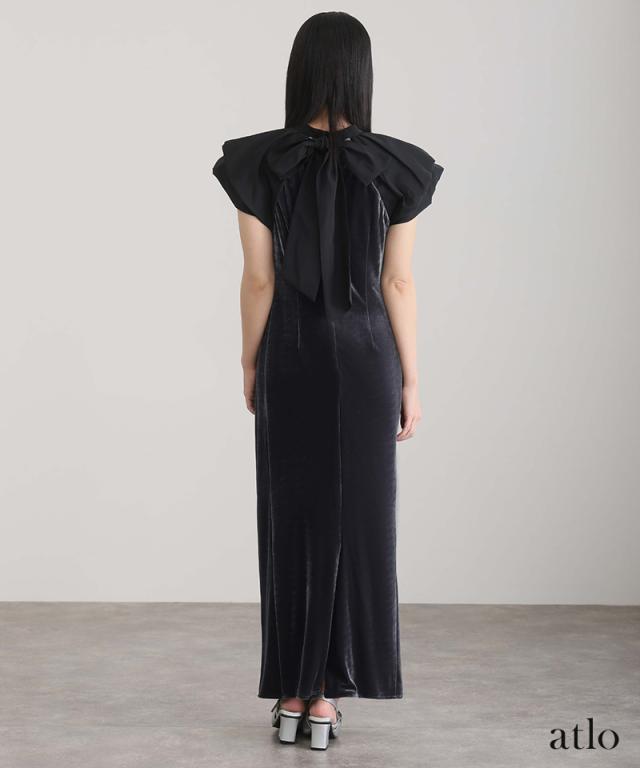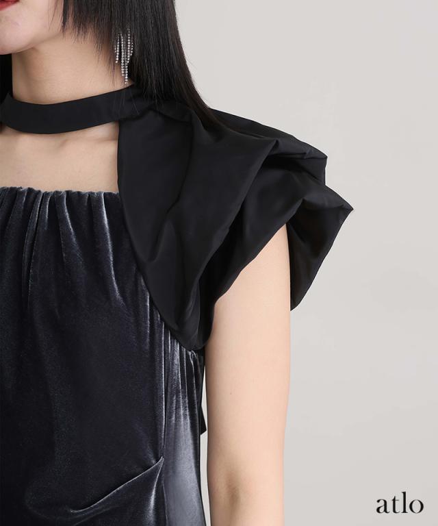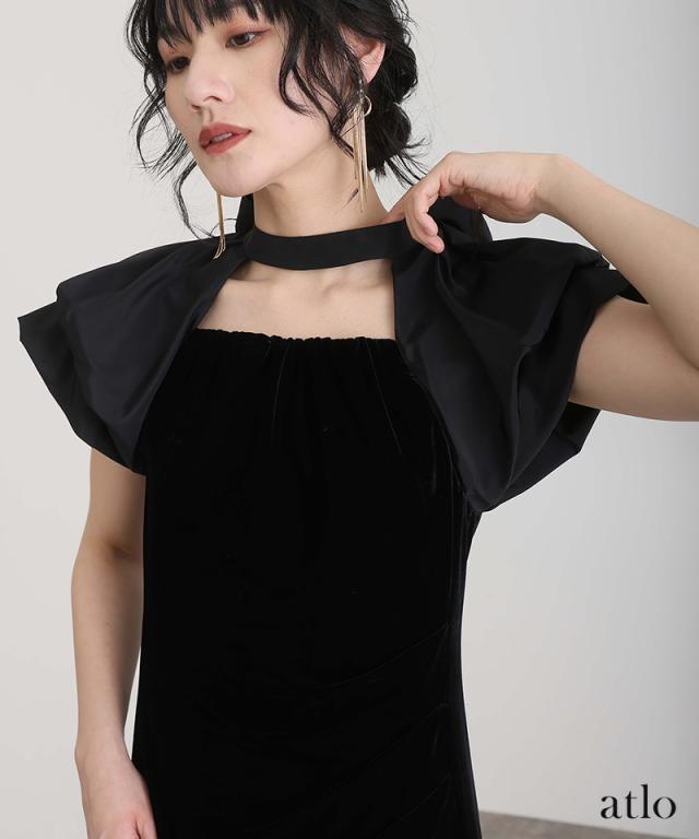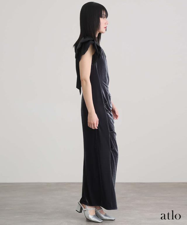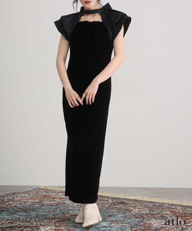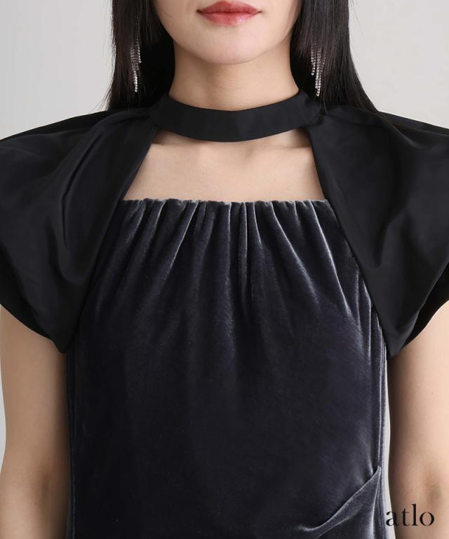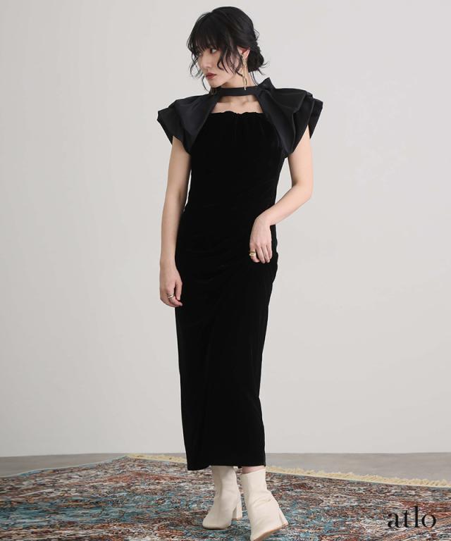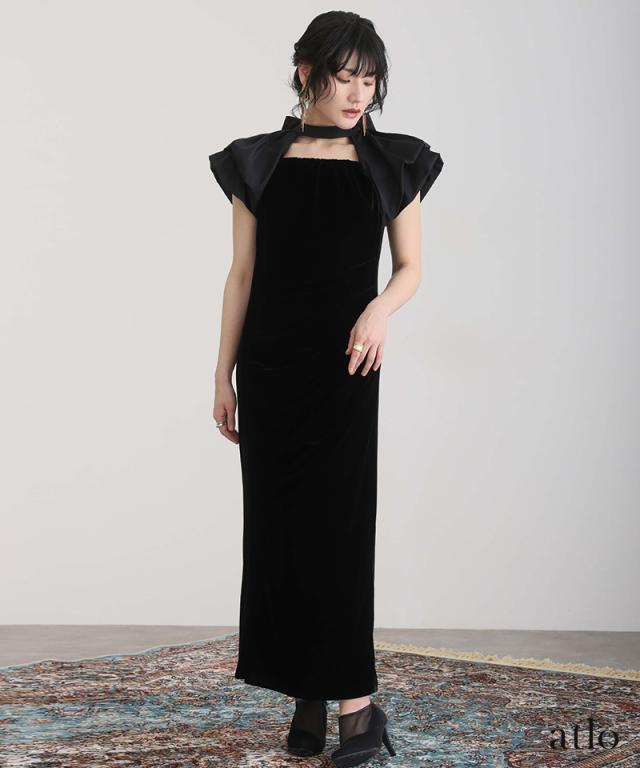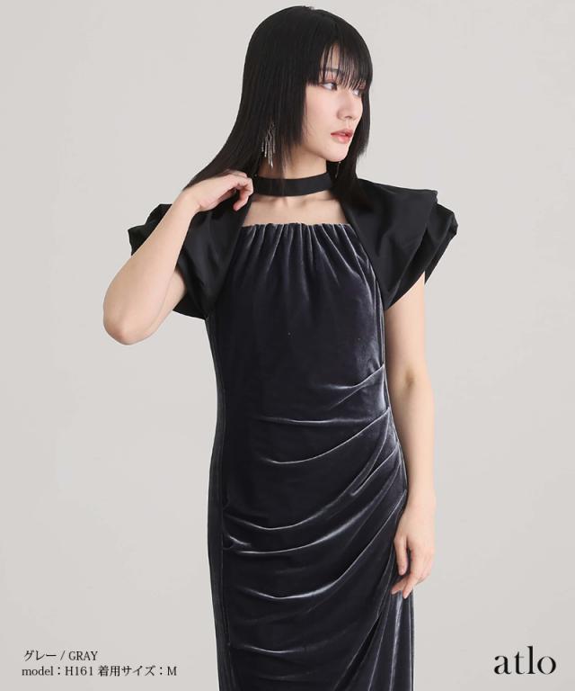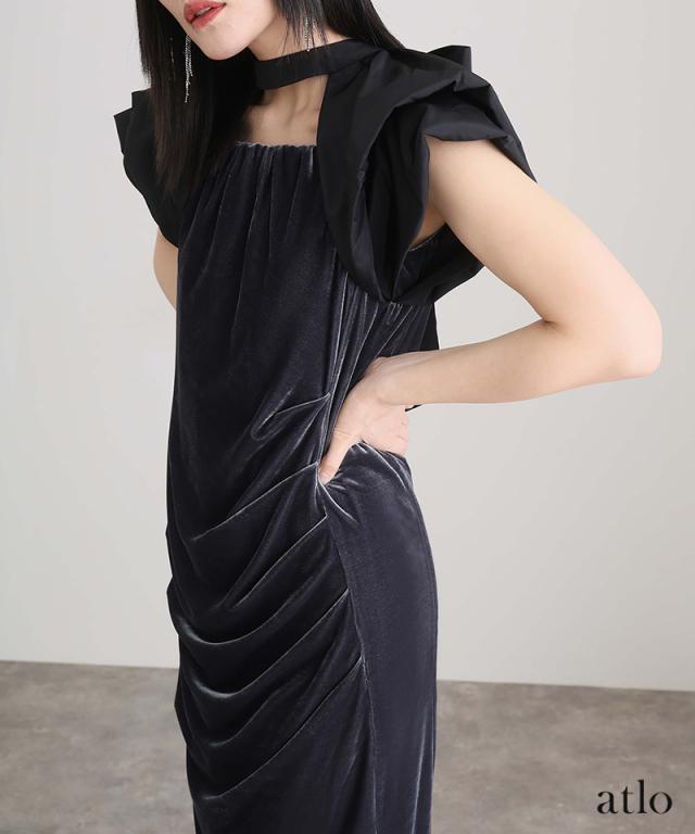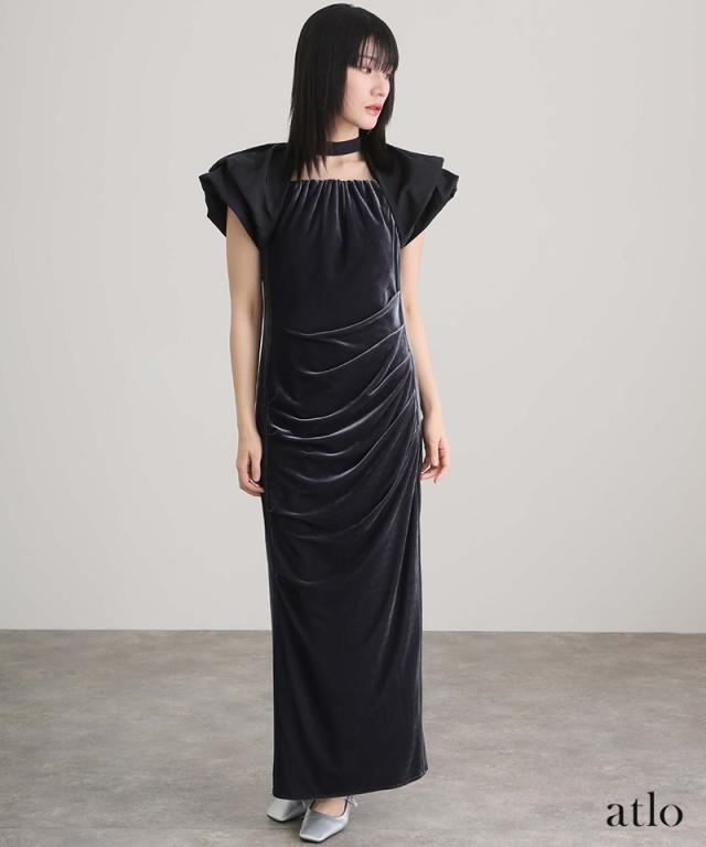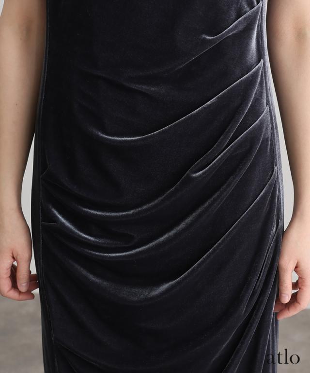 高級感のある滑らかなベロア素材を使用し、ドレープやデコルテが開いた華やかなドレス。