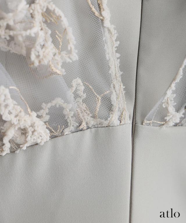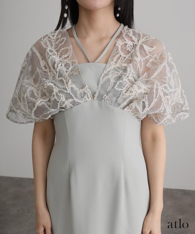 ラメ糸を使用した印象的な立体感のあるフラワー刺繍がデザインのポイント。
