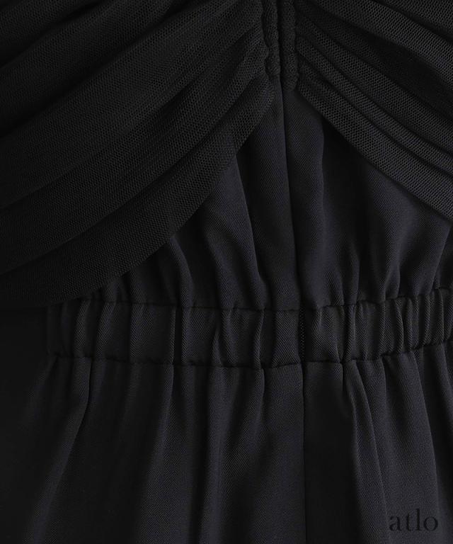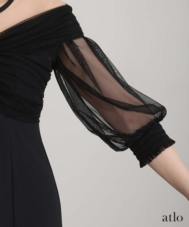 オフショルダー部分には肌色のチュールを仕様しているので、ズレを気にせず着用可能。