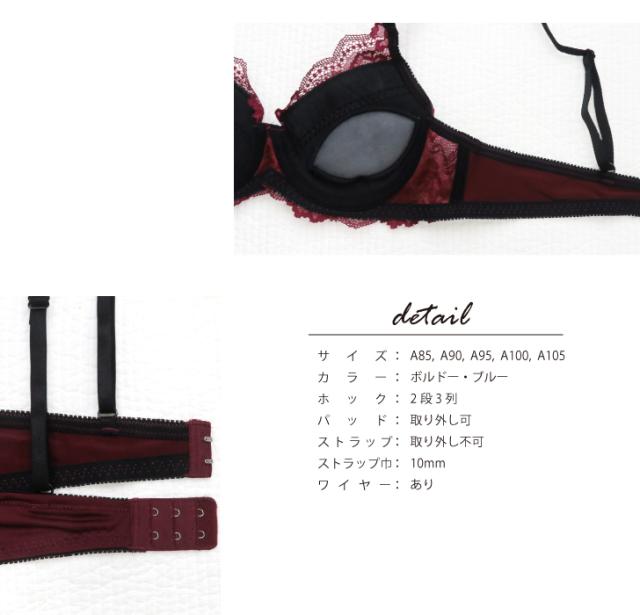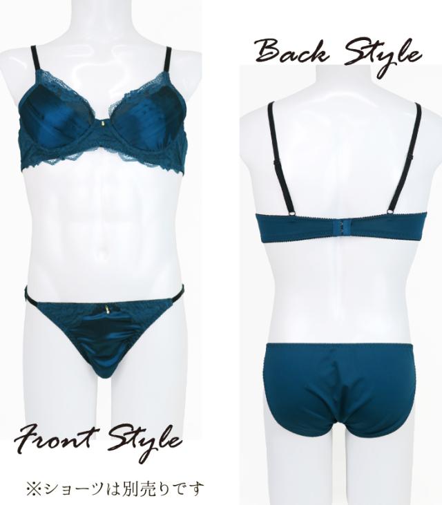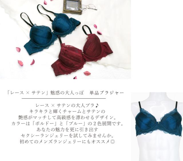 レース×サテンの大人ブラ♪キラキラと輝くチャームとサテンの艶感がマッチして高級感を漂わせるデザイン。カラーは「ボルドー」と「ブルー」の2色展開です。あなたの魅力を更に引き出すセクシーランジェリーを試してみませんか。初めてのメンズランジェリーにもオススメ◎