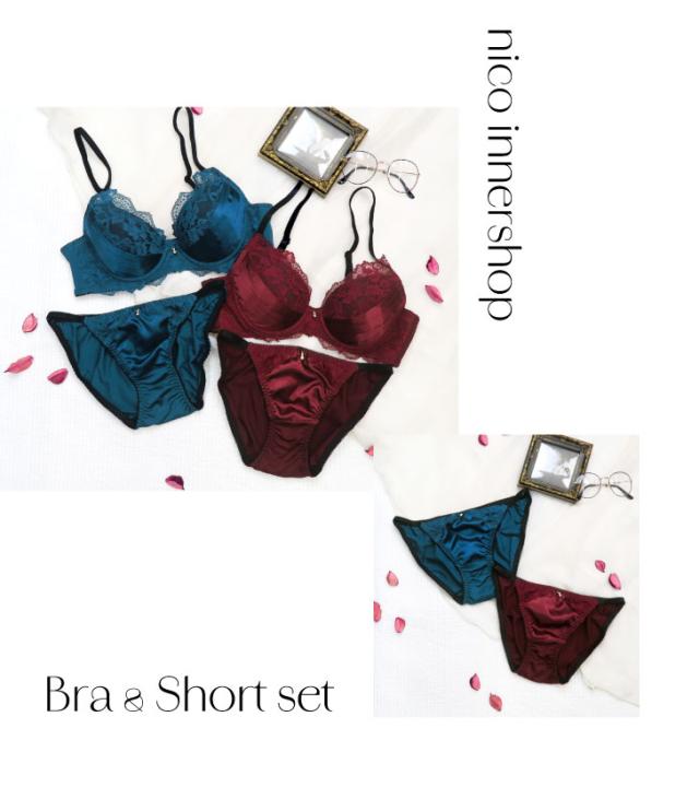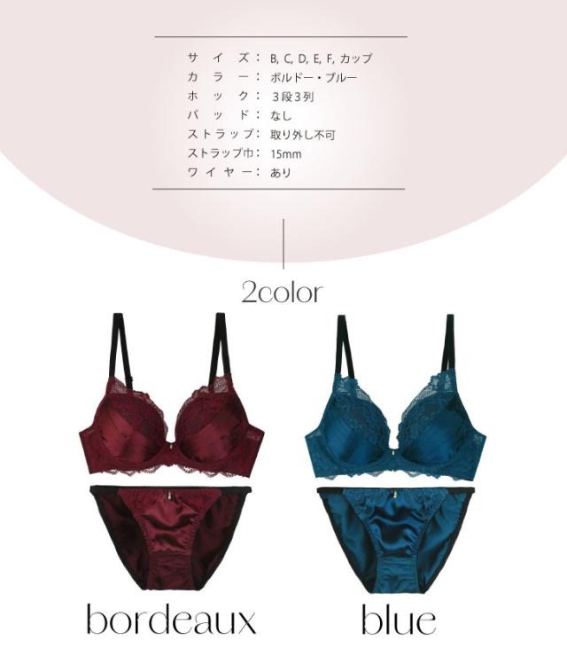 レース×サテンの大人ブラセット♪キラキラと輝くチャームとサテンの艶感がマッチして高級感を漂わせるデザイン。さらに脇高仕様で気になるポイントをしっかりカバー◎カラーは「ボルドー」と「ブルー」の2色展開です。あなたの魅力を更に引き出すセクシーランジェリーを試してみませんか。