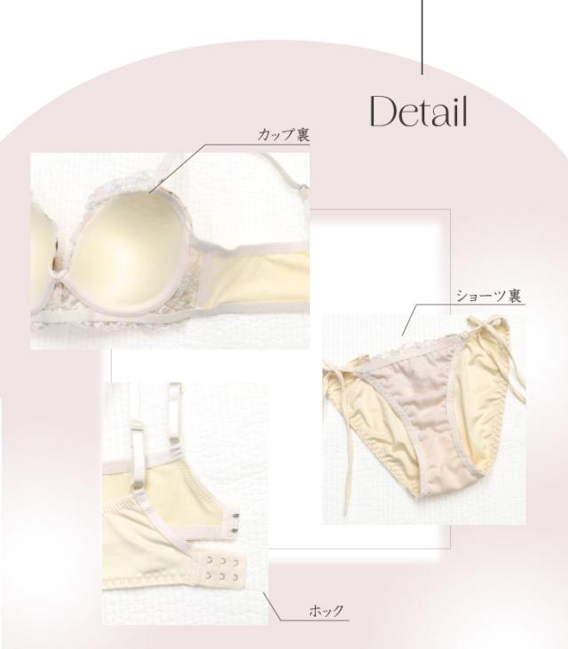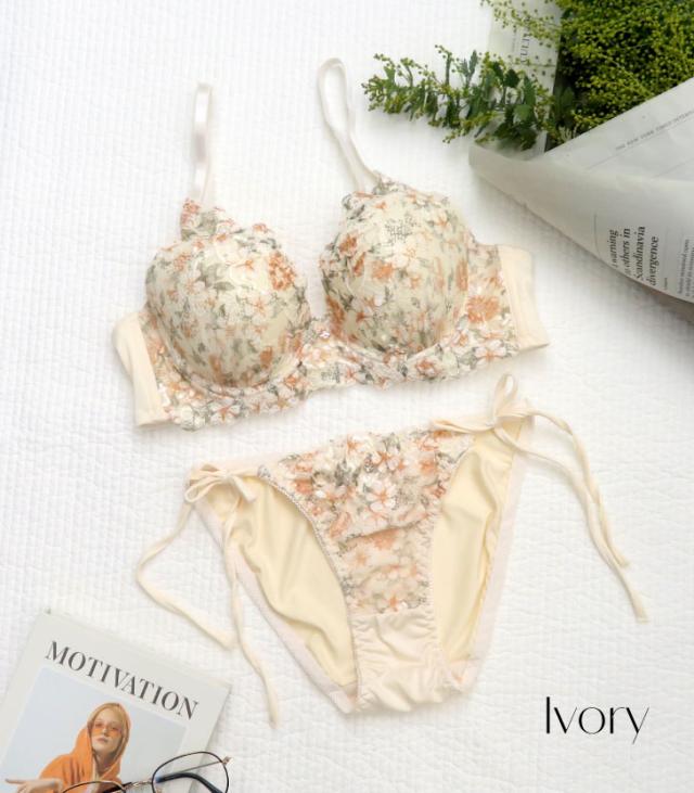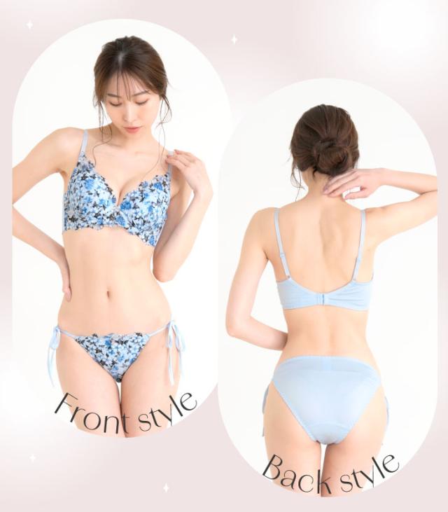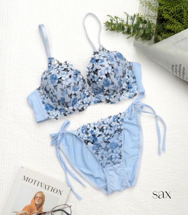 小花プリントを施したレースがヘルシーなブラセット♪紐ショーツにすることで、ちょっぴりセクシーさをプラス!カラーは「アイボリー」と「サックス」の2色展開。女性に嬉しい「脇高仕様」で気になる脇肉をしっかりとキャッチ◎沢山のこだわりとポイントが詰まった一着を是非お試しください♪