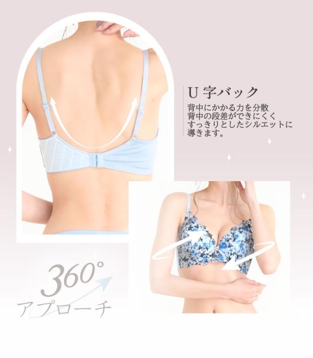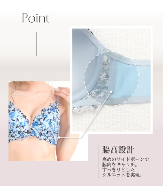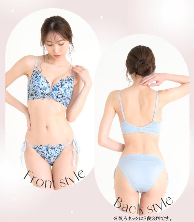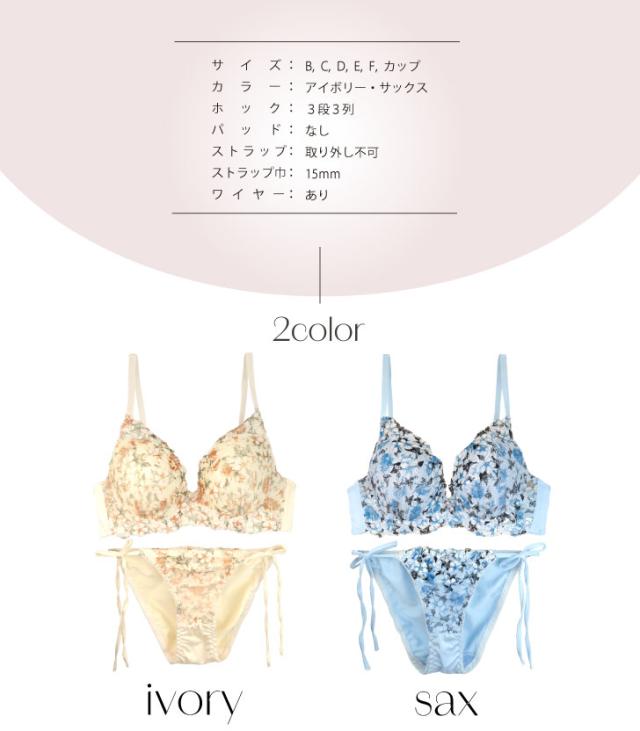 小花プリントを施したレースがヘルシーなブラセット♪紐ショーツにすることで、ちょっぴりセクシーさをプラス!カラーは「アイボリー」と「サックス」の2色展開。女性に嬉しい「脇高仕様」で気になる脇肉をしっかりとキャッチ◎沢山のこだわりとポイントが詰まった一着を是非お試しください♪