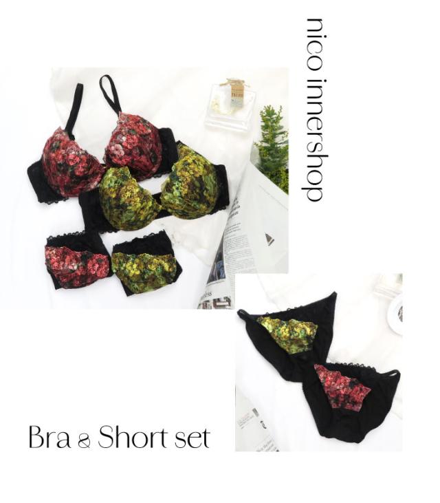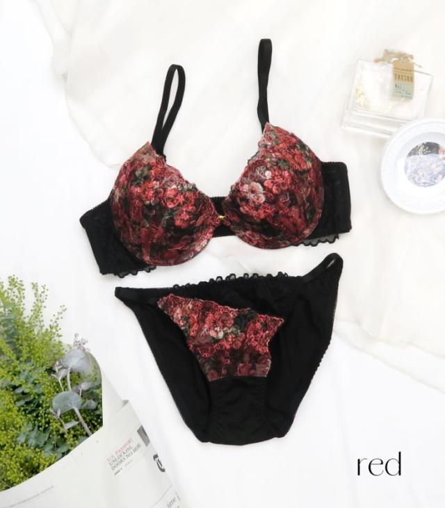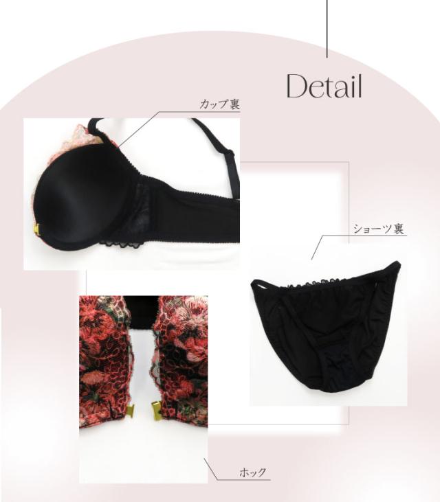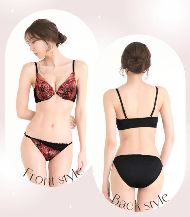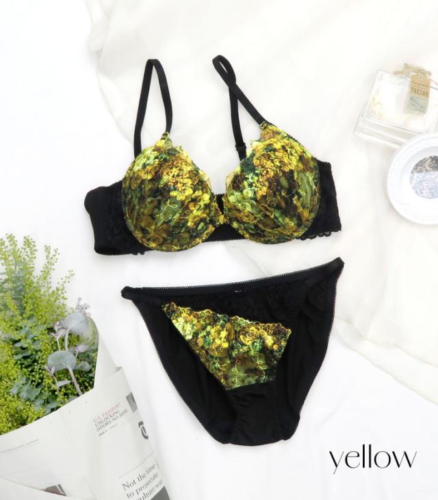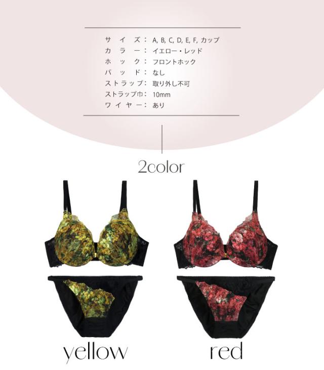 ビビットなフラワープリントレースが映えるように、ブラックを掛け合わせたシックな大人っぽブラ♪フロントホックで着脱が楽々◎ショーツのフロント部分がアシンメトリーになっていて、よりフラワーレースが映えるよう工夫されたデザインになっています。カラーは「イエロー」と「レッド」の2色展開です。セクシーでシックな大人ブラお試しください♪