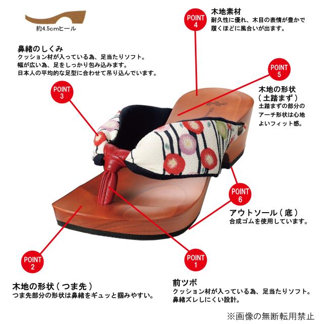 足裏にフィットするように施されたオリジナルの彫りと、クッション性のある鼻緒による履き心地の良さを実現した、浴衣や着物はもちろんお洋服にも似合うシンプルなデザイン。日本の伝統的なカタチがモダンな雰囲気を演出。