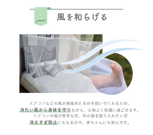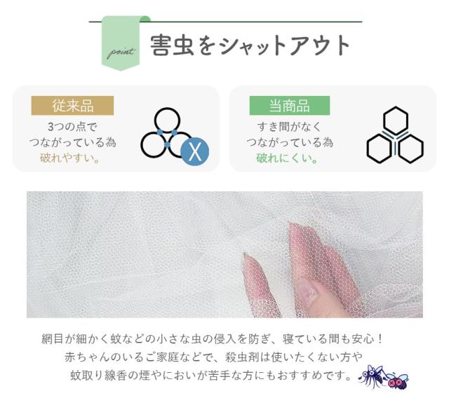網目が細かく、蚊などの小さな虫の侵入を防ぎ、寝ている間も安心。