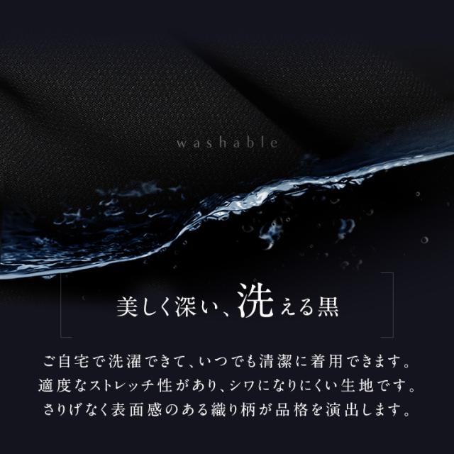 いつでもご家庭で洗えるブラックフォーマル。適度なストレッチ性があり、シワになりにくい生地です。さりげなく表面感のある織り柄が品格を演出します。