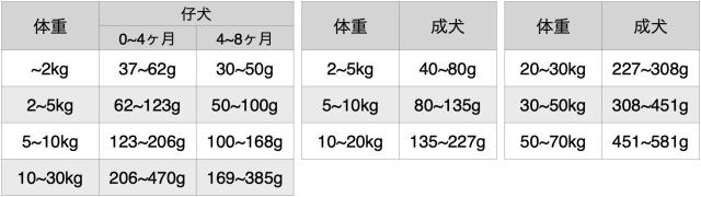 ・犬によって必要とする食事量は異なります。与え始めはこの表を参考にして、そのあと必要に応じて量を調整してください。