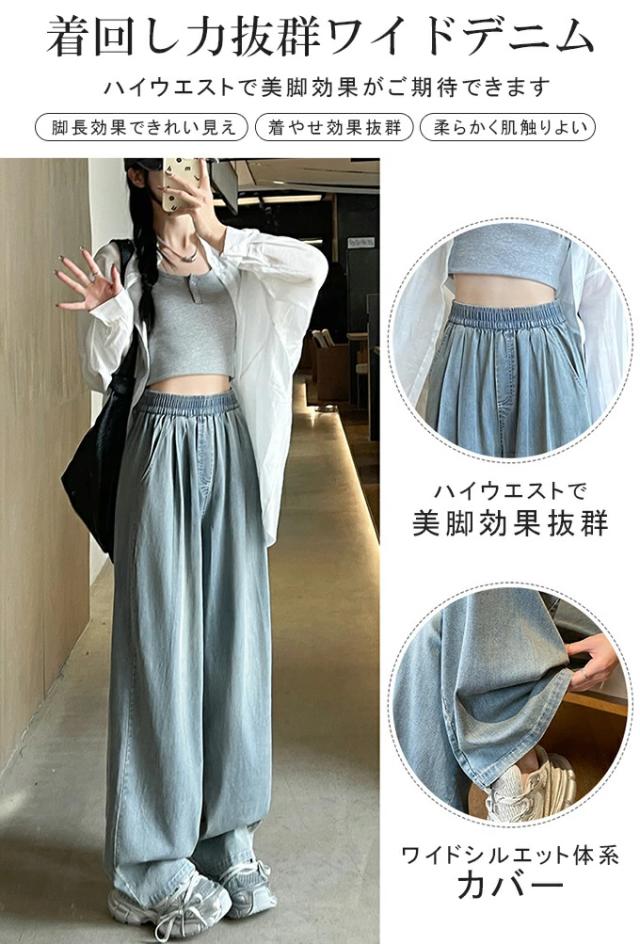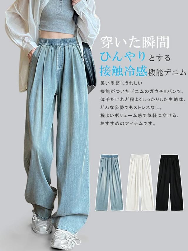 デニムパンツ ひんやり 接触冷感 ワイドデニムパンツ 涼感ワイドデニムパンツ ウエストゴム レディース ハイウエスト ジーンズ ひんやり 接触冷感 ワイドデニム UVカット 涼感ワイドデニムパンツ ウエストゴム レディース ハイウエスト ジーンズ きれいめ