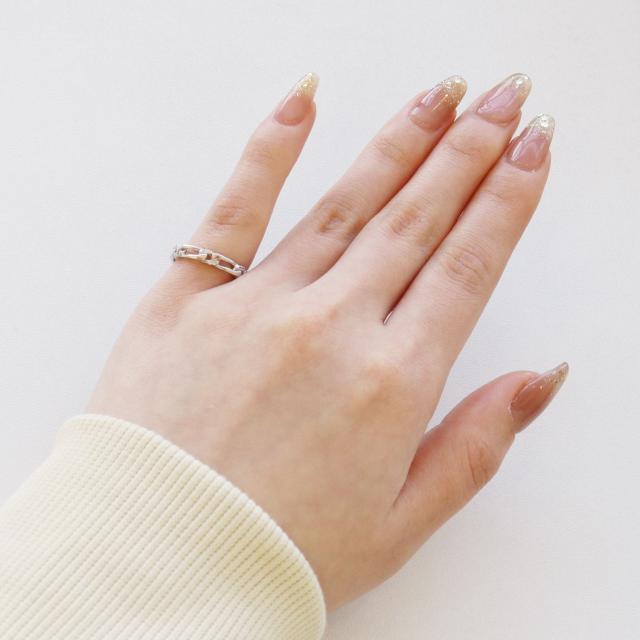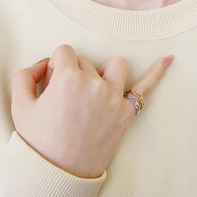 フィガロデザインの地金にジルコニアをセッティングしたリングは、 存在感のあるデザインが指元でキラキラと輝く、 華やかな雰囲気にお仕立ていたしました。