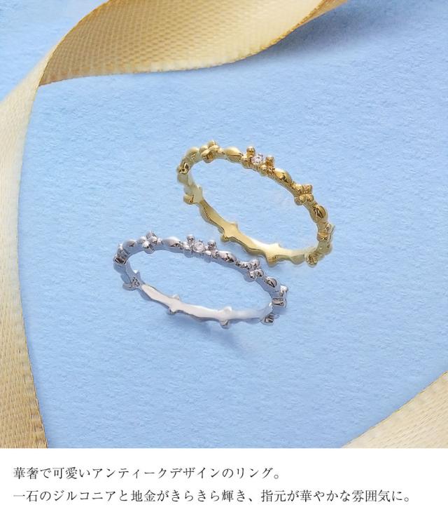 華奢でかわいいアンティークなデザインのリングは、 一石のジルコニアと地金が、指元でキラキラと輝く、 華やかな雰囲気にお仕立ていたしました。