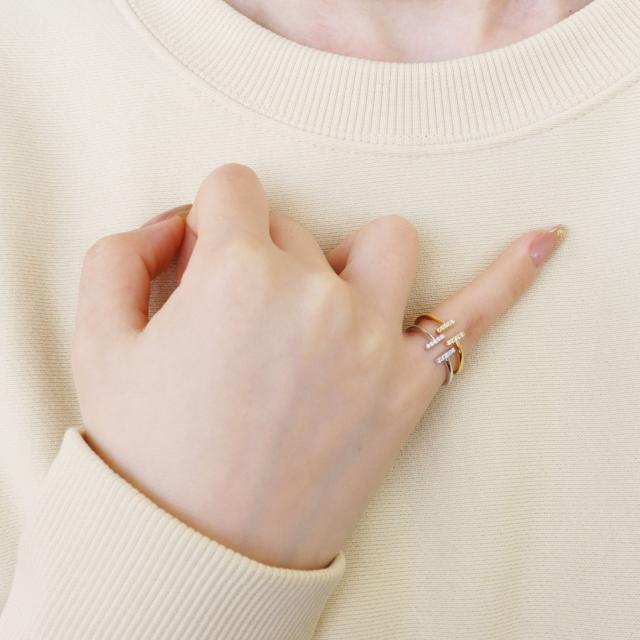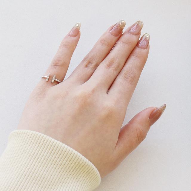 T字デザインの地金にジルコニアを多数セッティングしたリングは、 シンプルでどんなコーデにも合わせやすく、 ワンポイントでも華やかな雰囲気にお仕立ていたしました。