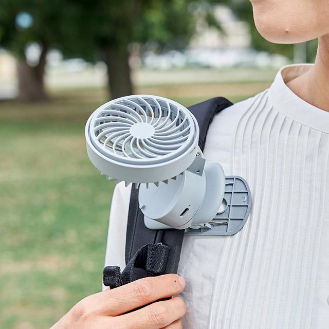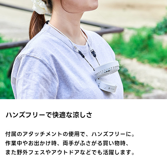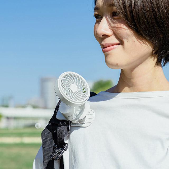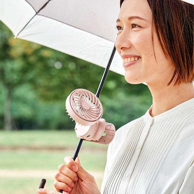 アタッチメントを付け替えることによって日傘、バッグなどに取り付けでき、あらゆるシーンで活躍するハンズフリーファンです。