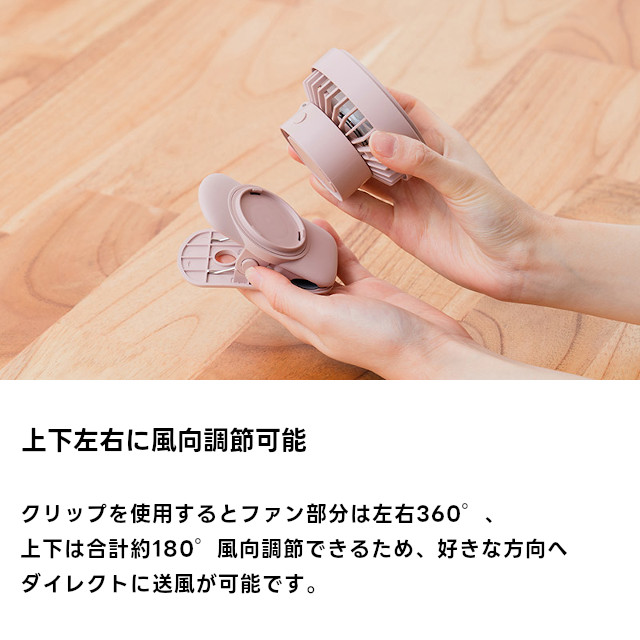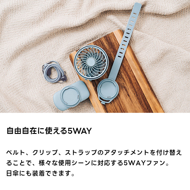 ファンにはミニクリップとベルトのアタッチメントを付属しており、クリップ、ベルト、ストラップ、卓上、手持ちの5WAY仕様。
