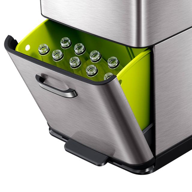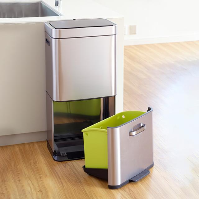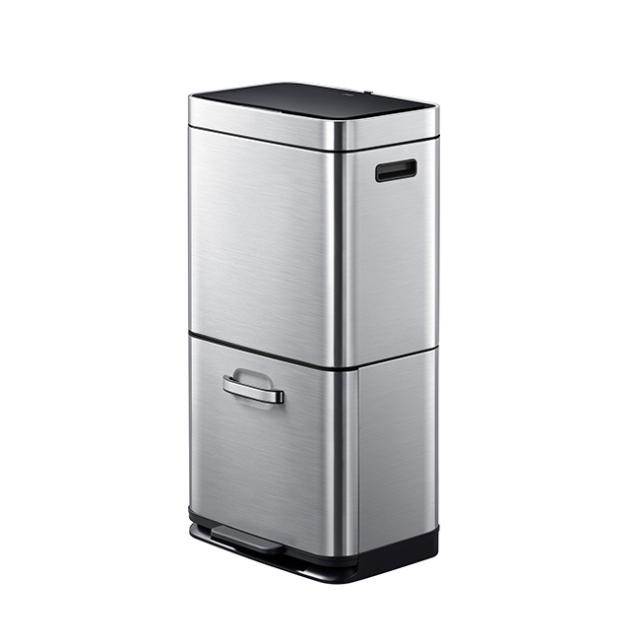分別に便利な上下2段式。上部は35Lのセンサー式ゴミ箱。フタの開閉を自動で行います。下部はペダルを踏むと開く25Lの引き出し式ゴミ箱。缶・ビン・ペットボトル・新聞紙・雑誌などの分別に便利です。