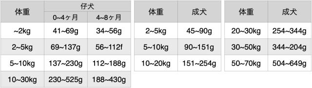 ・犬によって必要とする食事量は異なります。与え始めはこの表を参考にして、そのあと必要に応じて量を調整してください。