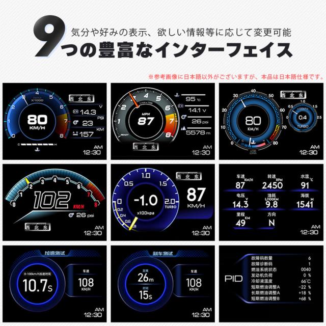 ・速度・時計・回転数・水温・電圧・燃料・消費量・運転時間・高度・衛星数・コンパス・加速テスト・ブレーキテスト・タービンテスト・車両全体のデータフロー・障害クリア・加速度テスト・低電圧テスト・水温データフロー等多くの機能搭載!