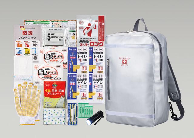 セット内容:避難用リュックバッグ、9光ライト、ホイッスル、携帯トイレ(大小兼用)1P×4、防寒アルミシート、ウェットティッシュ(20枚)、軍手、使い捨てカイロ×2、エイトバン(大小×各2)、ウェットボディタオル、ポケットティッシュ、マスク、防災ハンドブック