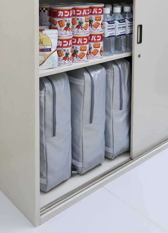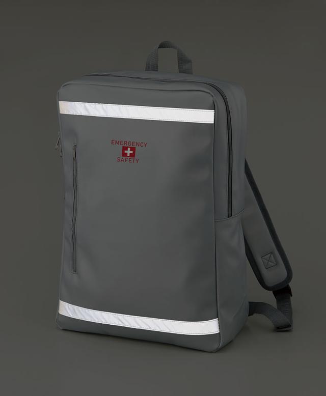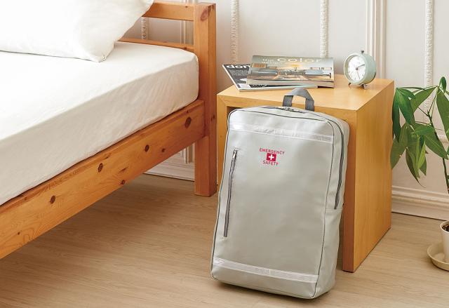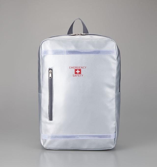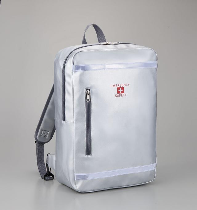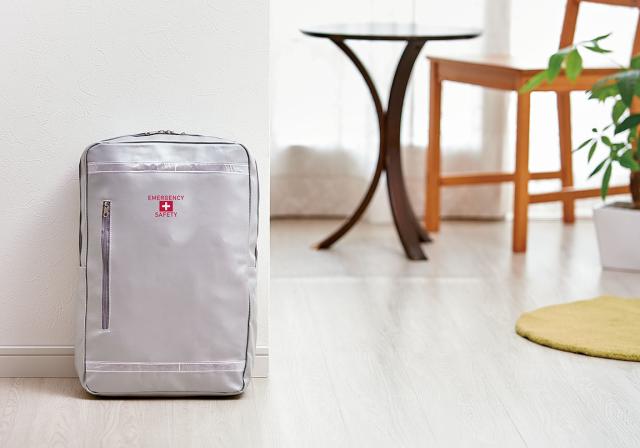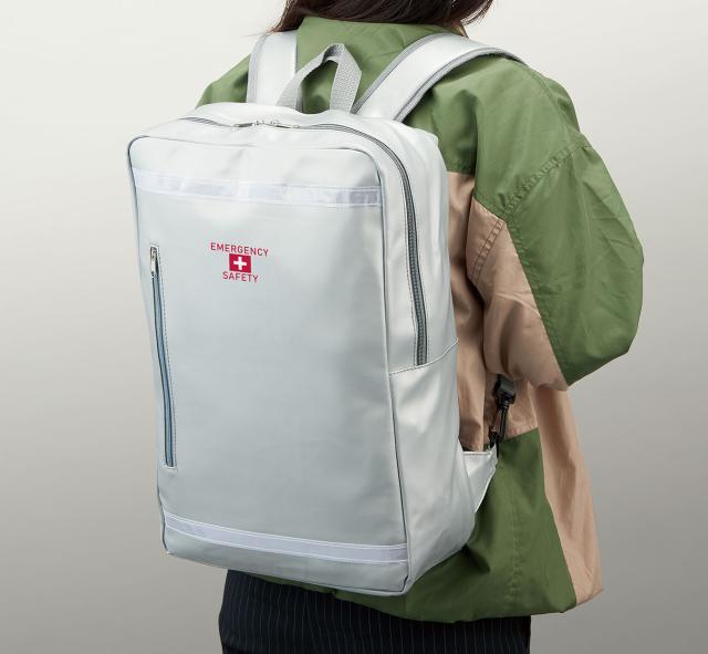 スマートなデザインと防災イメージを両立させたお洒落な避難用リュックに、災害時に役立つ小型懐中電灯や、緊急用トイレ、防寒アルミシートなどの防災グッズをひとまとめにした一人用防災セット。
