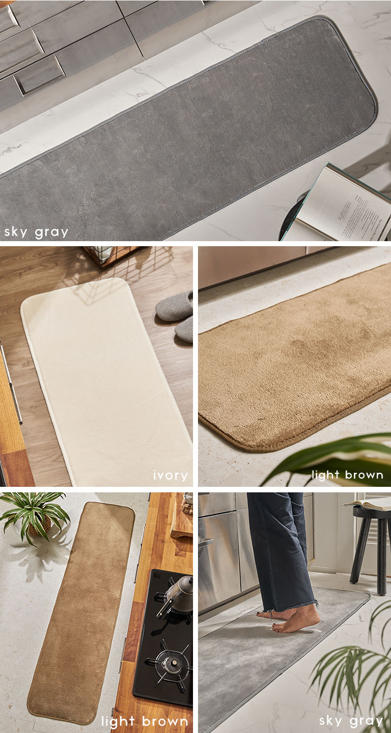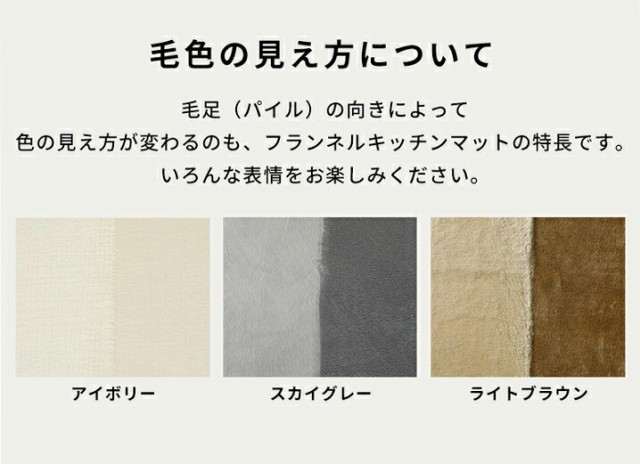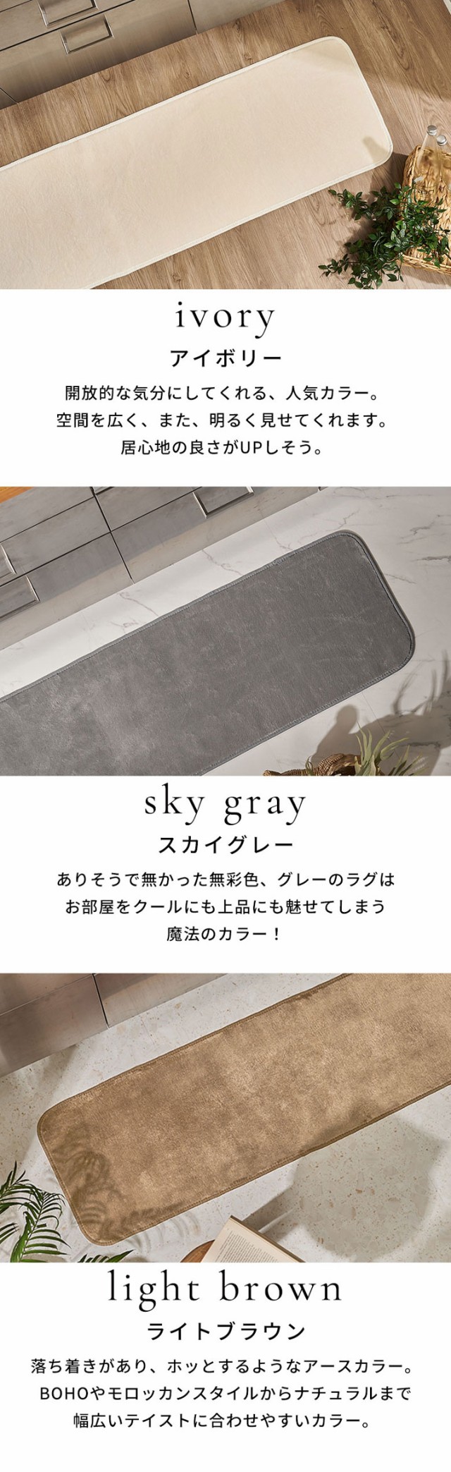 裏面はすべり止め付き。細長いサイズはキッチンでの利用以外にもベッドサイドのマットやごろ寝マットとしてもおすすめ。お部屋を広く見せてくれるアイボリー、クールなイメージを演出できるスカイグレー、落ち着いた空間に馴染むライトブラウンの3色をご用意しました。インテリアのテイストを選ばない、ベーシックなキッチンマットはお部屋のイメージチェンジにぴったりです。