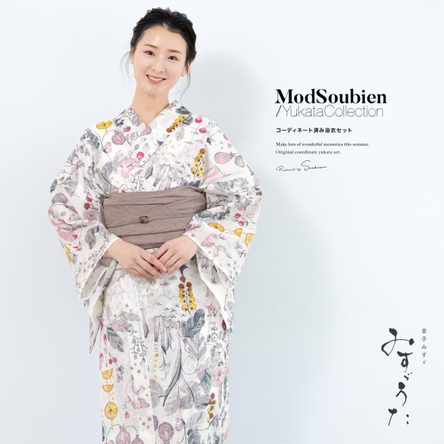 浴衣 セット レディース 浴衣セット 兵児帯 2025新作 みすゞうた 3点セット 白 ピンク 黄 グレー モダン 大人 おしゃれ 可愛い みすずうた 金子みすゞ 帯 下駄 フリー 送料無料