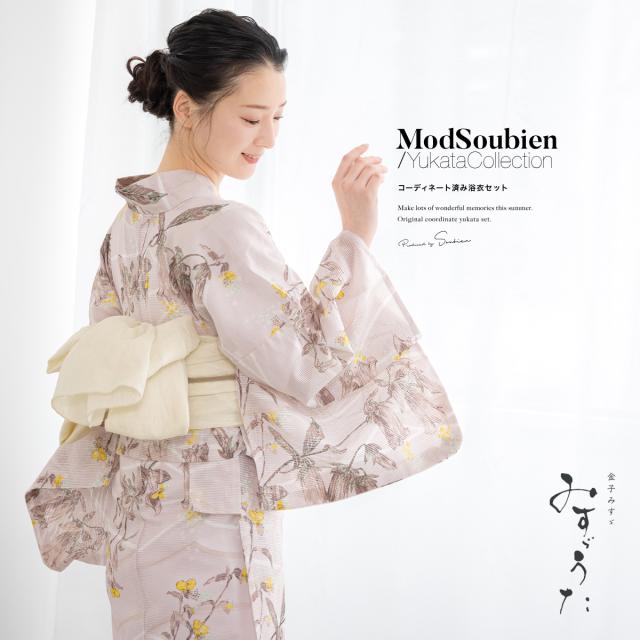 浴衣 セット レディース 浴衣セット 兵児帯 2025新作 みすゞうた 3点セット ピンク 白 花柄 モダン 大人 おしゃれ 可愛い みすずうた 金子みすゞ 帯 下駄 フリー 送料無料