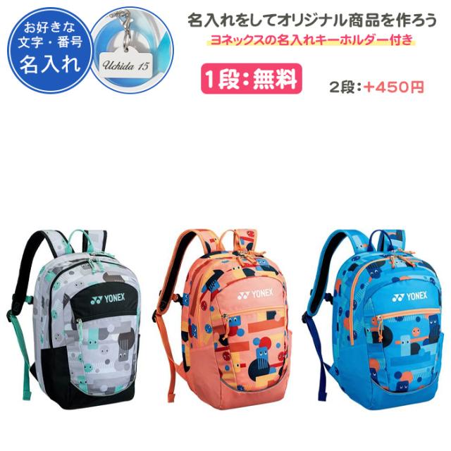 ヨネックスの名入れキーホルダー1個付き。 プレートへ名入れをしてオリジナル商品をつくちゃおー♪ チーム名、名前、好きな言葉などネームを入れることができます。 プレゼント、記念品、卒団におすすめです。 1段ネーム代:無料となっております。 2段ネーム代:+450円(税込)となっております。 プレートの名入れ文字数 ・漢字・平仮名が1段8文字まで ・英語は1段10文字まで テニスラケット1本収納可能なジュニア用バックパック。※プリント生地の都合上、柄の見え方が実際と異なる場合があります。 ジュニアバックパックの詳細 素材:ポリエステル 特徴:内ポケット、500MLペットボトル収納ポケット、ラケット1本収納部屋、再帰反射、YKKファスナー、チェストベルト 生産国:ベトナム サイズ:29×18×43CM 容量:18L カラー:244/グレー×ブラック、320/コーラルオレンジ、489/オーシャンブルー YONEXロゴキーホルダーの詳細 素材:本体/アクリル、チェーン/スチール 生産国:中国 サイズ:49×80×5mm カラー:001/レッド、002/ブルー、004/イエロー、007/ブラック、026/ピンク、039/パープル 名入れプレートの詳細 サイズ:約2.5cm×15.3cm ゴールド・シルバー・ホワイトのプレートの文字色はブラック ブラック・ブルー・レッド・クリスタルのプレートの文字色はホワイト