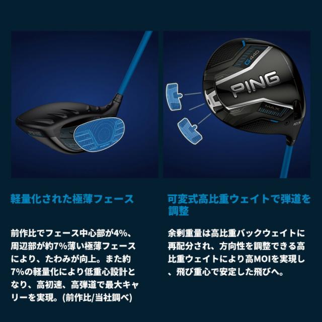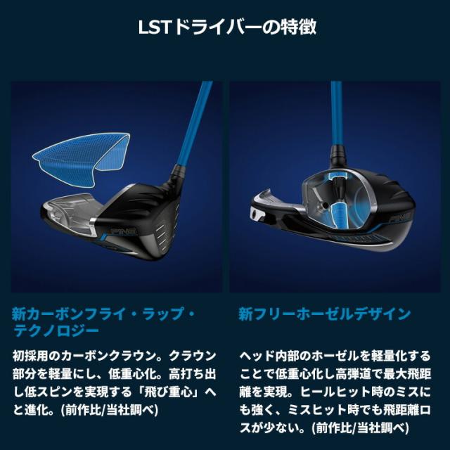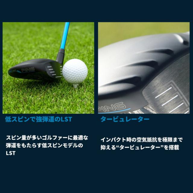 PINGが理想とする重心ラインに近づいた「飛び重心」設計でさらなる強弾道へと進化したG440LSTドライバー。「新カーボンフライ・ラップ・テクノロジー」により、クラウンの余剰重量をヘッド下部に再配置し、新設計の「フリーホーゼルデザイン」により、PING史上最も低い重心を達成し、高打ち出し低スピンを実現。フェースは前作よりも中心部で約4%、周辺部で約7%薄く設計され、飛距離性能が向上。 「スピンシステンシー・テクノロジー」で上下のミスヒットでも最適なスピン量と弾道で最大キャリーを実現。クラウンからソールまでの形状を改良することでさらなる快音へ。 ブレない低スピンG440LSTドライバー。