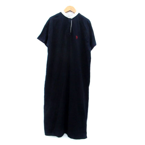 【中古】ユーエスポロアッスン ワンピース ヘンリーネック 半袖 ロング丈 刺繍 F 紺 ネイビー オフホワイト