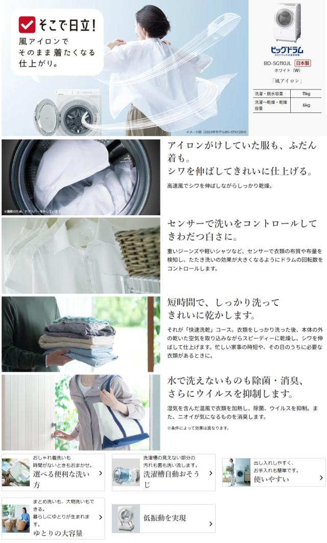 | ドラム式洗濯乾燥機 洗濯11kg乾燥6kg 左開き ビッグドラム BD-SG110JL W 「Aエリア限定配送」 スペック情報 | |