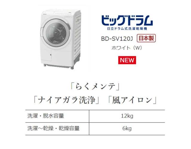 HITACHI 日立 【Aエリア限定配送】【標準配送設置無料】BD-SV120JL-W ドラム式洗濯乾燥機【洗濯12kg/乾燥6kg】左開き