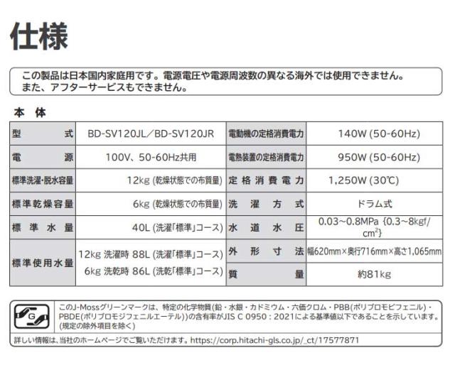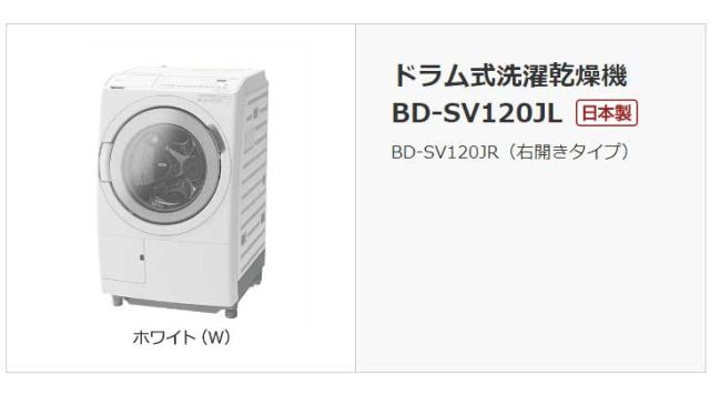 | 【Aエリア限定配送】【標準配送設置無料】BD-SV120JL-W ドラム式洗濯乾燥機【洗濯12kg/乾燥6kg】左開き スペック情報 | |
