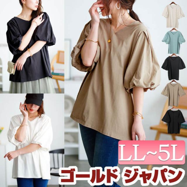 春新作 大きいサイズ レディース トップス カットソー Tシャツ Vネックパフスリーブコットンカットソー 5分袖 パフスリーブ バルーン ボリュームスリーブ Vネック ストレッチ ゆったり 春服 夏服 秋服 LL 2L 3L 4L 5L ブラック 黒 ミント オフホワイト 白 ゴールドジャパン