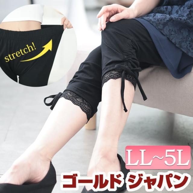 春新作 大きいサイズ レディース パンツ スパッツ レギンス 裾レース&ドロスト7分丈レギンス レッグウェア 7分丈レギンス レースレギンス 7分丈 レース くしゅくしゅ ストレッチ ウエストゴム ゆったり 春服 夏服 秋服 冬服 LL 2L 3L 4L 5L ブラック 黒 ゴールドジャパン