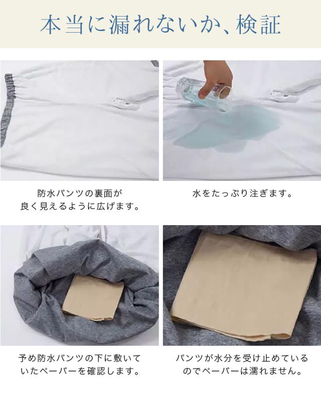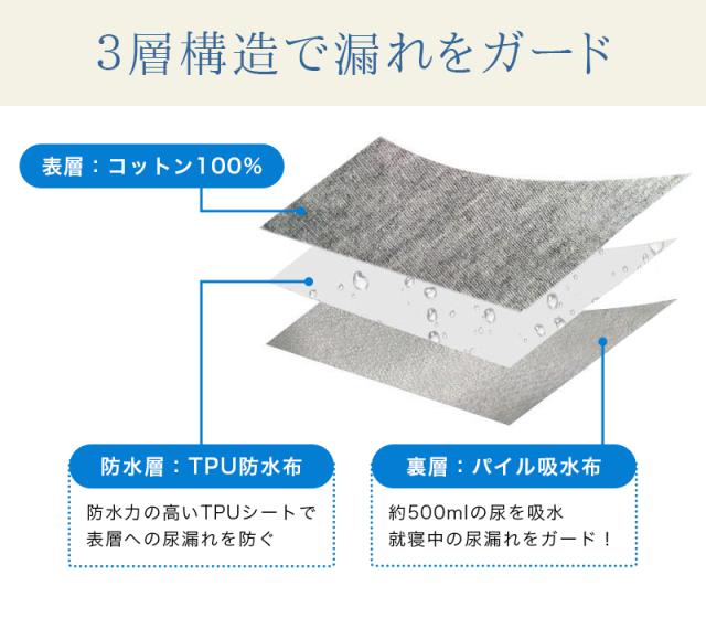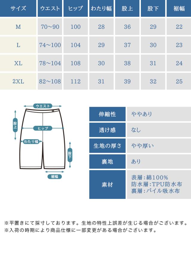 | 商品詳細 | 〇カラー:グレー/ネイビー 〇サイズ:M、L、XL、2XL 〇素材:表層/コットン100% 防水層/TPU防水布 裏層/パイル吸水布 ・脱ぎ着がしやすい、させやすい ・腰回りは柔らかく伸びの良い総ゴム設計 ・サイズ調整が可能なゴム入り ・体型を問わず優しい履き心地 ・360°防水&動きに追従 ・寝返りしても大丈夫 ・肌に優しい柔らかな綿100% |