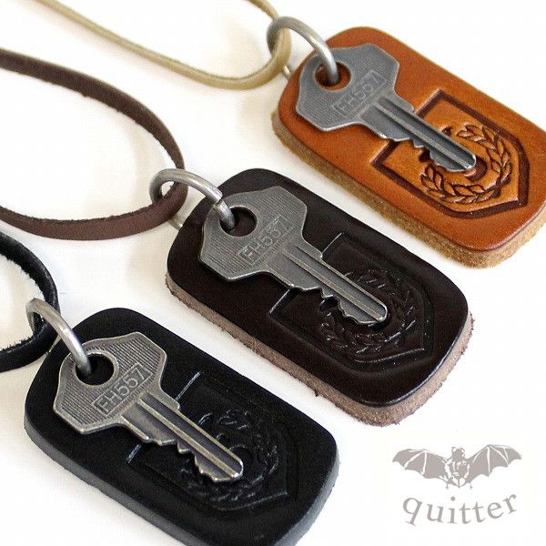 | 柔らかくて貴重なカーフレザー(仔牛革)をネック部分に使用しています。 クイッター刻印入りのドッグタグに、ヴィンテージ感を出す為にメッキを施したKEYをつけました♪ カップル向け!ペアでどうぞ! |