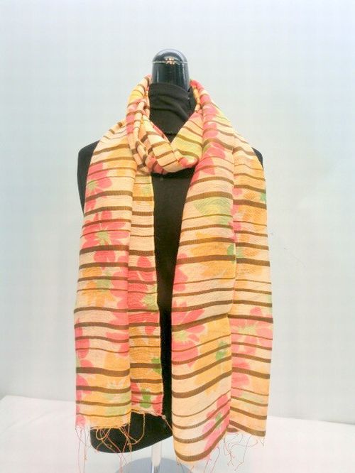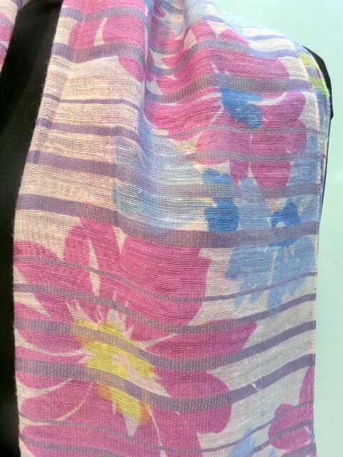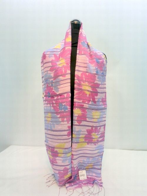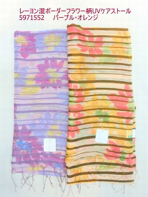 | ふんわり柔らかでサラサラ感のあるレーヨン混ストールです。 高級感のあるボーダー入フラワー柄をプリントしました。 秋冬のファッションのポイントや首周りのUVケアとしてもご使用ください。 |