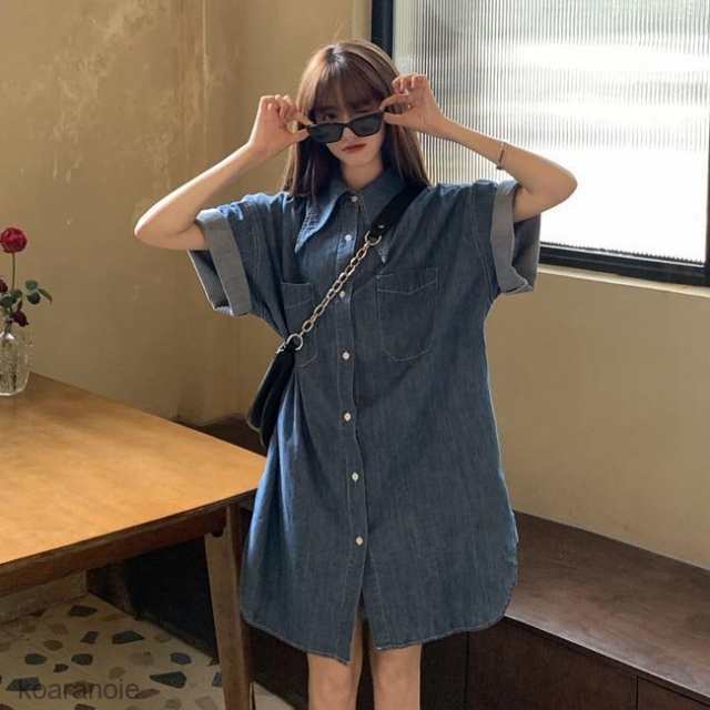 シャツワンピ デニムシャツ レディース デニムワンピース 半袖 シャツ ゆったり 膝丈ワンピース 半袖シャツ サマーワンピース カジュアル