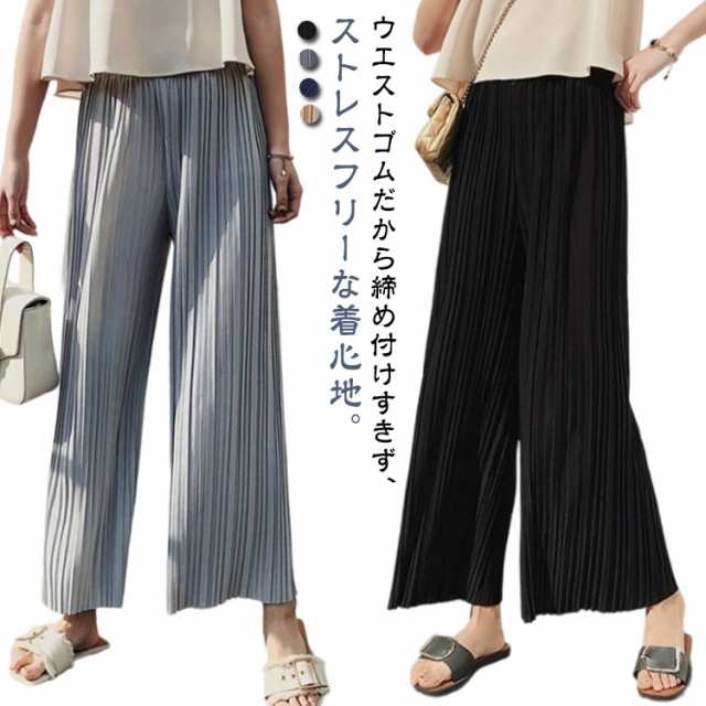 夏 プリーツワイドパンツ プリーツワイドパンツ ゆったり 無地 九分丈 ボトムス 通勤 レディース ストレート プリーツパンツ ウエストゴム 着?せ イージーパンツ 夏用 体型カバー 通学 アウトドア 大人女子 キレイめ カジュアル