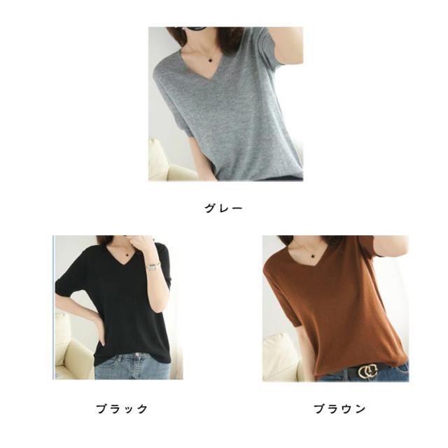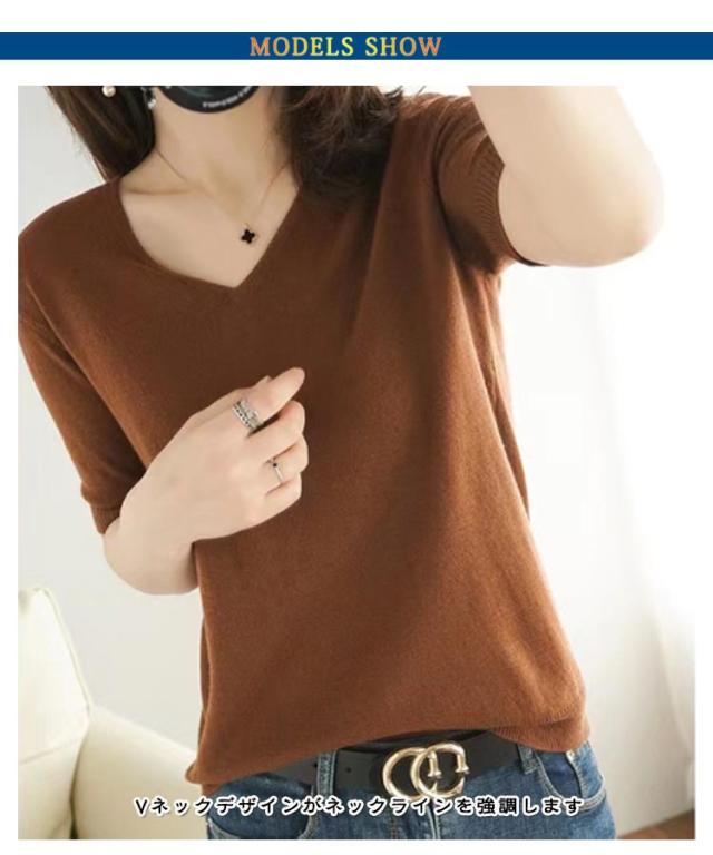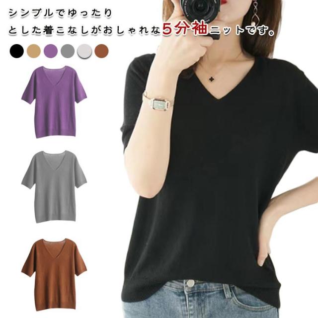 五分袖 レディース Vネック 秋 無地 ニット 半袖ニット 大人 春夏 トップス カジュアル ニット 体型カバー サマーニット シンプル オフィス オフィスカジュアル 20代 30代 40代 50代