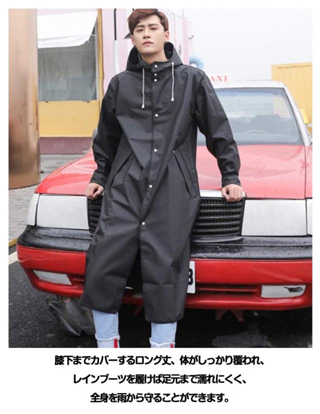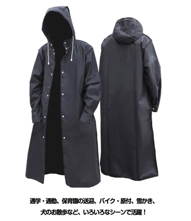 | シンプルなデザイン、男女兼用 膝下までカバーするロング丈、体がしっかり覆われ、レインブーツを履けば足元まで濡れにくく、全身を雨から守ることができます。 フードが大きめで透明ツバが雨を防ぎ、視界を守るので傘なしで自転車に乗れます。 通学・通勤、保育園の送迎、バイク・原付、雪かき、犬のお散歩など、いろいろなシーンで活躍! | |