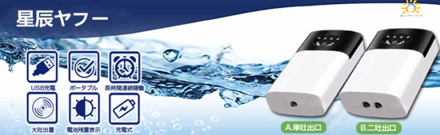 usb充電式ぶくぶくエアーポンプは「単吐出口」と「二吐出口」二つのモデルがあります。フル充電の場合、単吐出口モデル間欠モード10時間以上、連続モード6時間以上稼働可能。送風量1分あたり約3.0L、二吐出口モデル間欠モード15時間以上、連続モード9時間以上稼働可能。送風量1分あたり約2X3.0L。