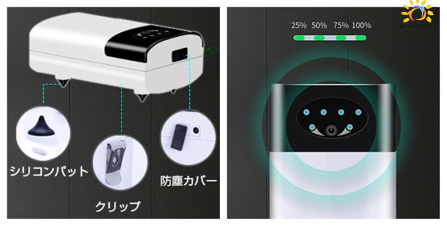 ぶくぶくエアーポンプはUsb充電式なので、モバイルバッテリー、車載電源、AC電源...電源がある限り、使えます。また、ブクブクエアーポンプの正面には電池残量表示ランプが付きなので、エアーポンプはあとどれぐらい使えるのか一目瞭然。
