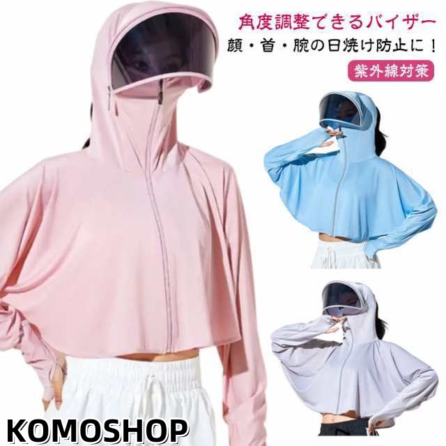 ラッシュガード サンバイザー付き レディース 長袖 パーカー UVカット パーカー 涼感素材 パーカー フード付き 夏 外出 冷感 紫外線対策 フェイスカバー 日焼け止め服 水着 体型カバー 全面保護 速乾 日よけ 軽量 薄手 アウトドア 自転車 通勤 通学 海 水遊び 送料無料