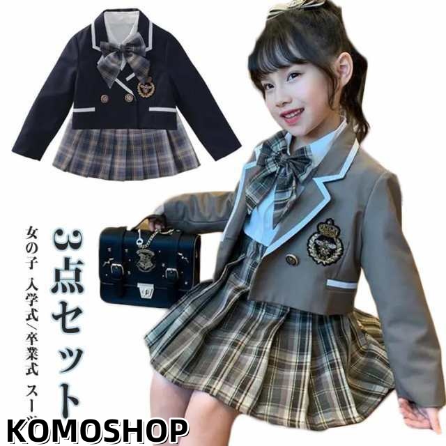 女の子 リボン付き プリーツスカート 上下セット フォーマルスーツ スーツ 卒園式 チェック柄 スーツ 卒業式 かわいい 長袖 セットアップ 春秋 入学式 子供 3点セット ジャケット チェック柄スカート 小学生 結婚式 七五三 撮影 発表会 子供服 フォーマル JK制服