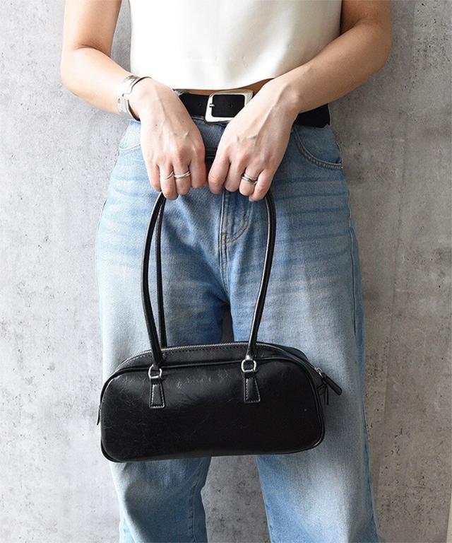 コーデのアクセントになる、スリムなシルエットが魅力のロングハンドルボストンバッグ。