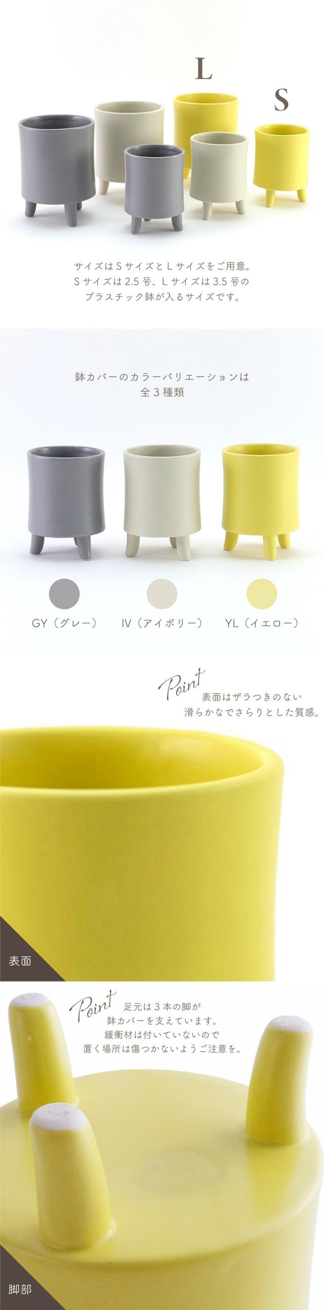 ぽってりした厚みと丸みを帯びたフォルム、やわらかなカラーリングで愛嬌のある三つ脚のシルエットが魅力的。Sサイズは2.5号のプラスチック鉢が入るサイズ感です。カラーバリエーションは全3色をご用意。