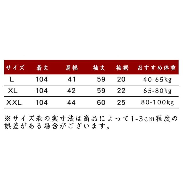 | サイズについての説明 | 【L】着丈104cm 肩幅41cm 袖丈59cm 袖裾20cm おすすめ体重40-65kg【XL】着丈104cm 肩幅42cm 袖丈59cm 袖裾22cm おすすめ体重65-80kg【2XL】着丈104cm 肩幅44cm 袖丈60cm 袖裾25cm おすすめ体重80-100kg※サイズ表の実寸法は商品によって1-3cm程度の誤差がある場合がございます。 |